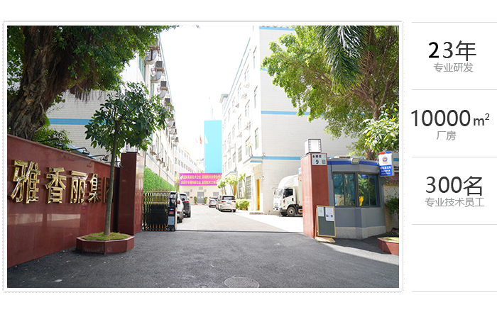 占地面積一萬余平方米,專業技術員工300余人,雅香麗憑借著在行業內的專業化、精細化、特色化、新穎化、可持續(xù)化,榮獲國家"高新技術企業"、"深圳市專精特新中小企業"等重量級認證。